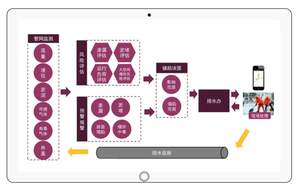 管網安全運行監管:通過監測管網流量、液位等管網運行參數及時發現排水管網錯接、滲流、淤堵導致的水污染等問題。 城市內澇應急指揮:汛前,接入氣象雷達信息,提前發布汛情預警,根據監測數據提前對管網采取疏通、清淤等預處理工作;汛中,實時監測管道運行指標,按照防汛預案進行指揮調度。汛后,完成應急處置過程評估為后續防汛準備工作提供知識庫。 管網事故次生衍生災害預警:根據監測數據,結合排水管網爆炸模型、路面塌陷模型,對沼氣等可燃氣體聚集產生的大規模爆炸 風險、管線滲漏導致的路面塌陷事故進行及時預警。
